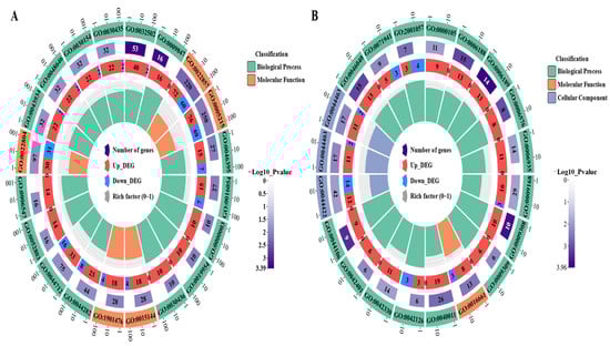 GO enrichment analysis results of DEGs. (A) GO enrichment results of LvsH; (B) GO enrichment results of MvsH (the diagram of GO enrichment: from outside to inside, the outermost circle is the ID number of GO enrichment, the second circle is the background gene, the third circle is the number of DEGs, and the fourth circle is the enrichment factor. That is, the number of DEGs divided by the number of background genes).