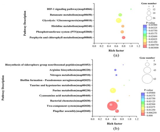 The KEGG enrichment analysis showed that the DEGs of LvsH were mainly concentrated in the porphyrin and chlorophyll metabolism, PTS, histidine metabolism, glycolysis/gluconeogenesis, butyrate metabolism, and HIF-1 signaling pathway (Figure 6a). The DEGs of MvsH were mainly concentrated in KEGG pathways such as the arginine biosynthesis, flagellar assembly, two-component system, and nitrogen metabolism (Figure 6b).