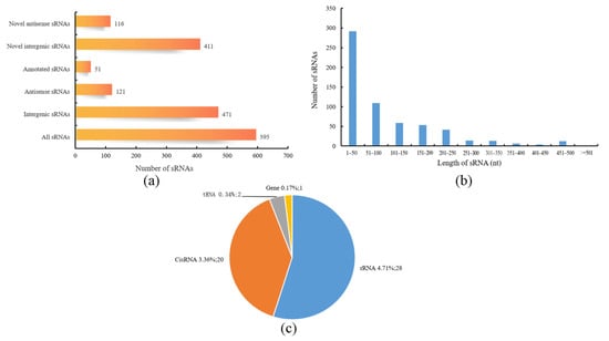 Characteristics of sRNAs. (a) Statistics of cis-acting sRNAs and trans-acting sRNAs; (b) sRNA length distribution; (c) Rfam annotation statistics of sRNAs.