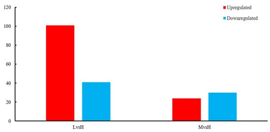 To systematically determine the DEGs’ possible functions and participating pathways, we performed GO and KEGG pathway enrichment analyses on the DEGs. The GO enrichment analysis showed that the GO annotations of the DEGs were divided into three parts: biological process (BP), cellular composition (CC), and molecular function (MF). It was found that the top 20 GO terms that were enriched by the DEGs of LvsH were mainly divided into three categories, namely transporter activity, sporulation, and catabolism of histidine and acidic organic compounds (Table S6). The top 20 GO terms that were significantly enriched in DEGs in MvsH were mainly enriched in five aspects: histidine synthesis, nucleotide synthesis and metabolism, oxidoreductase activity, sports, and metabolism of nitrogenous inorganic salts (Table S7). The corresponding numbers of DEGs in the significantly enriched pathways in LvsH and MvsH are shown in Figure 5.