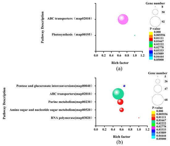 To further evaluate the function of the significantly differentially expressed sRNAs’ target genes, we performed GO and KEGG enrichment analysis on these target genes. The sRNAs’ target genes that were significantly differentially expressed in LvsH were greatly enriched. The top 20 GO terms in the set were divided into six categories: ATPase activity, hydrolase activity, transporter activity, localization, material transport, and nucleoside triphosphatase activity (Table S8). The sRNAs’ target gene enrichment pathways of MvsH are classified into 10 categories, namely transporter, nucleoside sugar synthesis, plasma membrane, others, nucleotide synthesis and metabolism, nitrogen metabolism, metal ion transport, ATPase activity, anhydride hydrolase, and amino acid synthesis (Table S9). The KEGG enrichment results show that LvsH significantly differentially expressed the sRNAs’ target genes and enriched two genes, including those related to photosynthesis and the ABC transporter, as shown in the KEGG pathway (Figure 10a). MvsH significantly differentially expressed the sRNAs’ target genes and enriched five KEGG pathways, namely “RNA polymerase, amino sugar and nucleotide sugar metabolism, purine metabolism, ABC transporter, pentose and glucuronate interconversion” (Figure 10b).