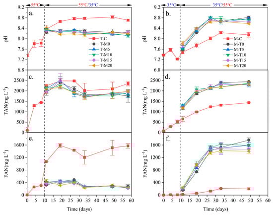 Changes in pH, TAN, and FAN during the digestion process ((a) pH of T-M; (b) pH of T-M; (c) TAN of T-M; (d) TAN of M-T; (e) FAN of T-M; and (f) FAN of M-T).