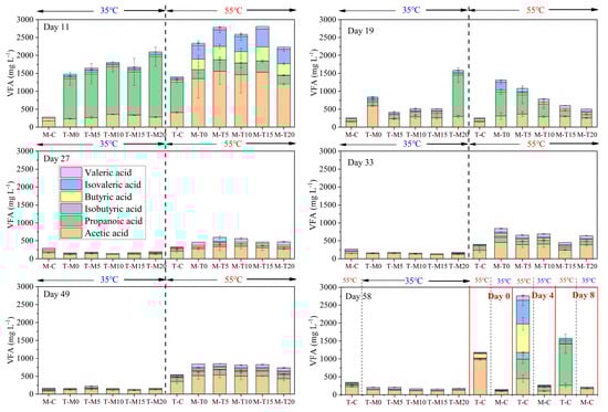 Changes of VFA during the digestion process (M: 55 ± 2 °C; T: 35 ± 2 °C).