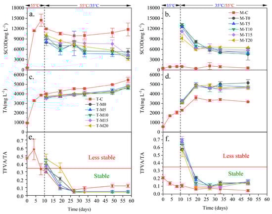 Changes of SCOD, TA, and VFA/TA during the digestion process ((a) SCOD of T-M; (b) SCOD of T-M; (c) TA of T-M; (d) TA of M-T; (e) TVFA/TA of T-M; and (f) TVFA/TA of M-T).