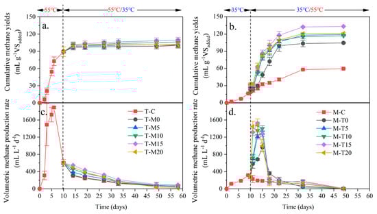 The cumulative methane yields of T-C were higher than that of M-C (Figure 4a,b), probably because the hydrolytic bacteria, acid-forming bacteria, and methanogens in the thermophilic temperature digesters were more active than those in the mesophilic temperature digesters [40].