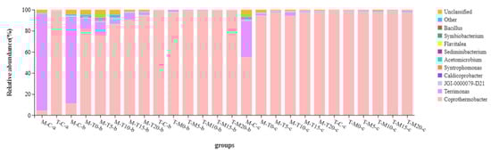 On the ninth day, at mesophilic temperature, the bacterial community before the temperature change was dominated by Terrimonas (91.93%) and Coprothermobacter (4.17%) (Figure 5). At thermophilic temperature, the bacterial community was dominated by Coprothermobacter (99.04%) (Figure 5). Terrimonas is a Gram-negative bacterium belonging to the phylum Bacteroidetes, an important phylum in mesophilic anaerobic digesters associated with the breakdown of proteins and cellulose [45]. Bacteroidetes, colonies such as Terrimonas, can break down simpler organic substances such as fatty acids and lactic acid, producing hydrogen and some organic acids [41]. Coprothermobacter is mainly involved in the acid-producing phase of anaerobic digestion [46]. Coprothermobacter has strong activity at thermophilic temperatures, and it can cooperate with hydrotropic methanogenic bacteria to degrade organic pollutants [47]. Coprothermobacter and Methothermobacter can act synergistically to degrade organic matter [48,49,50]. On the 27th day, the bacteria communities of M-T0, M-T5, M-T10, M-T15, and M-T20 were more diverse than that of T-M0, T-M5, T-M10, T-M15, and T-M20. This phenomenon fits perfectly with the results of VFA and SCOD, which was an important reason for the high methane yield of M-T two-phase digesters. On the 43rd day, all digesters were dominated by Coprothermobacter (except M-C). The RA of Terrimonas gradually decreases with the progress of the digestion process. This phenomenon should be related to the fact that proteins and cellulose have been greatly broken down in the early stage of the digestion process [30,45].