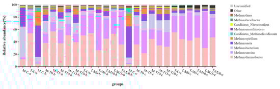 On the 27th day, the archaea communities of M-C were dominated by Methanosaeta (50.06%), Methanospirillum (23.34%), Methanobacterium (9.31%), Methanothermobacter (4.98%), and Methanosarcina (2.00%). The archaea community of T-C was dominated by Methanothermobacter (49.77%), Methanosarcina (34.03%), Methanobacterium (5.96%), Methanosaeta (3.42%), and Methanospirillum (3.00%). The archaeal community of mesophilic–thermophilic two-phase digesters was dominated by Methanothermobacter (37.10–55.96%), Methanosarcina (12.65–21.79%), Methanobacterium (17.18–21.46%), Methanosaeta (3.43–12.95%), and Methanospirillum (3.00–9.86%). The archaeal community of thermophilic–mesophilic two-phase digesters was dominated by Methanothermobacter (26.38–53.28%), Methanosarcina (32.08–57.56%), Methanosaeta (1.50–7.88%), Methanobacterium (2.54–5.89%), and Methanospirillum (1.56–4.23%).