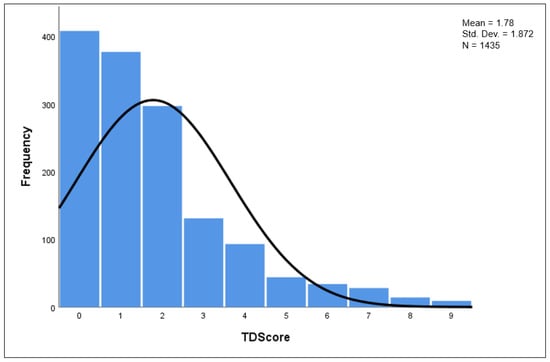 Figure 1 shows the distribution of the TD score across all 1435 participants in the study who had symptom data available for analysis; 412 participants met the classic definition of TD.