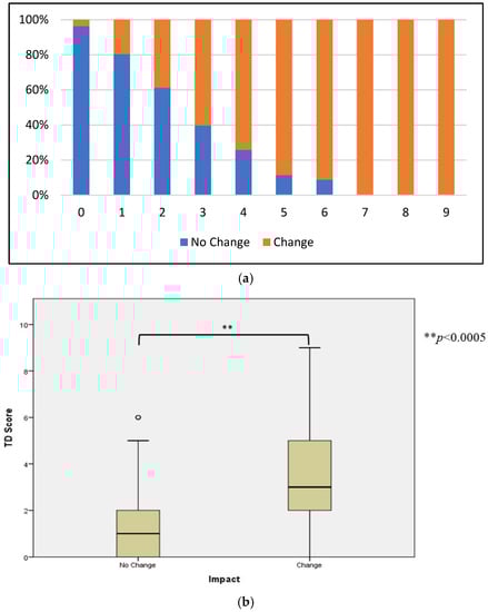 TD Severity Score and Impact on Activity. (a) Distribution of TD scores across OEV-118 subjects reporting change vs. no change in activity. (b) Logistic regression predicting likelihood of changing activity based on TD severity score.