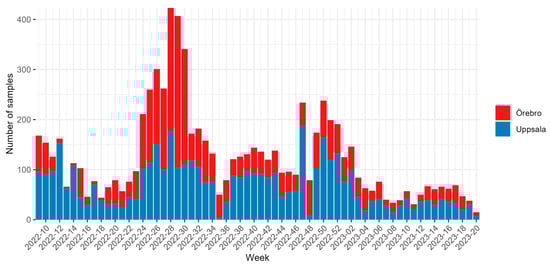 Between 1 March 2022, to 18 May 2023, 7950 SARS-CoV-2 positive samples were successfully whole-genome sequenced and analyzed, which is presented in this study. Of these samples, the majority (i.e., 6710) were obtained during 2022 and the remaining (i.e., 1240) were from 2023. Approximately half of these samples (i.e., 4478) were from the Uppsala region and the rest (i.e., 3472) were from the Örebro region. The distribution of samples sequenced over time is shown in Figure 1.