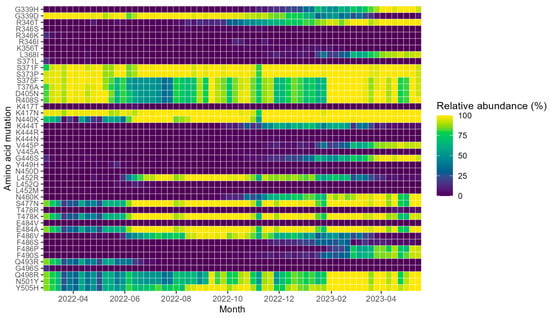 Among the amino acid (aa) mutations in the RBD that are involved in mAb resistance, several changed in their relative abundance throughout the study period (Figure 3). The over-time relative abundance of all aa substitutions in the S protein of SARS-CoV-2 from samples collected during the period March 2022 to May 2023 can be seen in Figure S1.