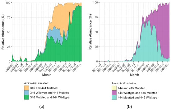 Relative abundance per week (in %) from March 2022 to May 2023 of SARS-CoV-2 sequences containing amino acid (aa) mutations in positions 346, 444, and 445 of the Spike (S) protein. Mutations in other positions are present in these sequences but not shown here. (a) Positions 346 and/or 444 (mainly R346T and K444T), are relevant for resistance against tixagevimab and cilgavimab. (b) Positions 444 and/or 445 (mainly K444T and V445P), are relevant for resistance against bebtelovimab. x-axis: year-month.
