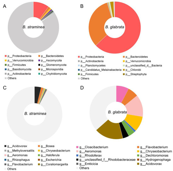 The relative abundance of gut bacteria of B. straminea (n = 4) and B. glabrata (n = 5): at the phylum level of B. straminea (A) and B. glabrata (B) and at the genus level of B. straminea (C) and B. glabrata (D). The top ten most common gut microbes are shown.