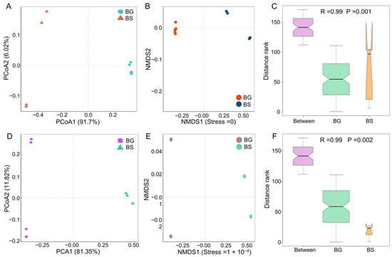 The differences in community structures of gut bacteria between B. straminea (n = 4) and B. glabrata (n = 5). (A) PCoA analysis. (B) NMDS. (C) ANOSIM. (D) PCoA analysis. (E) NMDS. (F) ANOSIM. Pictures (A–C) show the difference in bacterial community structure based on the phylum level. Pictures (D–F) show the difference in bacterial community structure based on the genus level. BG: B. glabrata. BS: B. straminea.