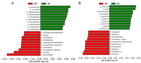 A linear discriminant analysis (LDA) effect size (LEfSe) analysis of gut microbiota of B. straminea (n = 4) and B. glabrata (n = 5): (A) at the phylum level, and (B) at the genus level. The top 20 most different gut microbes are shown. BG: B. glabrata. BS: B. straminea.
