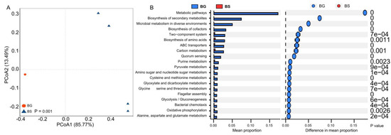 The difference in gut bacterial functions of B. straminea (n = 4) and B. glabrata (n = 5). (A) PCoA analysis. (B) STAMP analysis. The top 20 most significantly different functions of B. glabrata and B. straminea gut microbiota are shown, respectively. BG: B. glabrata. BS: B. straminea.