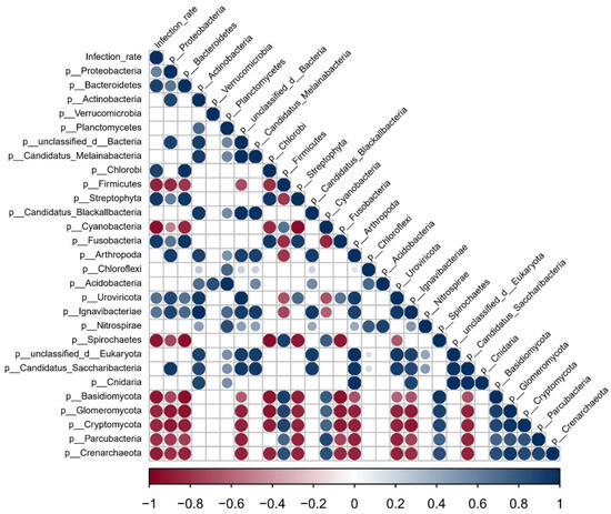 Spearman correlation shows the associations between snail gut microbiota and infection rate. The circle size indicates the magnitude of the correlation. The circles in color indicate p < 0.05. Specifically, the red circles represent a correlation coefficient greater than 0, while the blue circles represent a correlation coefficient less than 0. The affix “P_” indicates the phylum level.