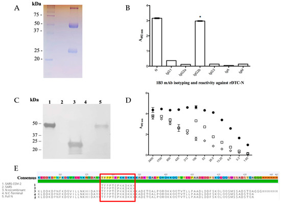 Anti-DTC-N 1B3 mAb purification and characterization. (A) The 12% SDS/PAGE anti-DTC-N 1B3 mAb profile stained with Coomassie Blue after the G protein affinity column purification. (B) Anti-DTC-N 1B3 mAb isotyping analysis. C96 MaxiSorp ELISA microtiter plates coated with 10 µg/mL of recombinant rDTC-N or 1 µg/mL of IgG1, 2a, 2b, IgG3, IgA, and IgM, incubated with 100 µL supernatants of anti-DTC-N 1B3 mAb and with rat anti-mouse kappa conjugated with horseradish (1:1000). The asterisk (*) indicates statistically significant differences as compared to all the other isotypes of IgG, and IgA and IgM subclasses (p ≤ 0.0001). (C) Immunobloting analysis. Nitrocellulose membrane containing 10 µg of (1) DTC-N (SARS-CoV-2); (2) N-terminus protein N (SARS-CoV-2); (3) C-terminus protein N (SARS-CoV-2); (4) DENV-2 NS1 recombinant protein; (5) full-length control protein N (SARS-CoV-2). Membrane was probed with the anti-DTC-N 1B3 mAb (1:100) at a concentration of 870 µg/mL and goat anti-mouse IgG conjugated with peroxidase (1:5000). (D) Anti-DTC-N 1B3 recognition patter. The 10 µg/mL rDTC-N, heated-treated [100 °C for 10 min (□), DTT-treated (◇), or intact (●) were used as solid phase-bound antigens. The anti-DTC-N 1B3 mAb was serially diluted (log2) from an initial concentration of 0.007 μg/mL. (E) Alignments of the anti-DTC-N 1B3 mAb epitope with N protein sequences. The epitope sequence recognized by anti-DTC-N 1B3 mAb was aligned with protein N partial sequences, comprised between amino acids 352 and 434 from SARS-CoV-2, SARS, and with sequences obtained for the full-length N and N-terminal recombinant proteins.