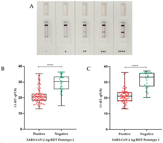 Validation of Ag-RDT prototypes based on RT-qPCR. (A) Illustrative figures of Ag-RDT results. Figures show tests with different intensities of reaction as detected by the Ag-RDT. According to the signal strength of the positive samples on the test line (T), the results were classified as + (low intensity), ++ (moderate to low intensity), +++ (moderate to high intensity), and ++++ (high intensity). In the absence of the appearance of a test line (T), the sample was considered negative (−). (B) Box plot analysis of RT-qPCR and Ag-RDT prototype 2. RT-qPCR Ct values (for positive samples only) as compared with positive and negative results obtained with prototype 2 Ag-RDT. The median Ct value found for the false-negative samples on SARS-CoV-2 Ag-RDT (30.4) was significantly different from the median Ct value found for the positive samples on SARS-CoV-2 Ag-RDT (20.6). (C) Box plot analysis of RT-qPCR Ct value (positive only) compared with prototype 3 Ag-RDT results. The median Ct value found for the false-negative samples on SARS-CoV-2 Ag-RDT (33.2) was significantly different from the median Ct value found for the positive samples on SARS-CoV-2 Ag-RDT (21.1) (p < 0.0001 was indicated by ****). Boxplot analysis (2B and 2D) was performed by applying the Mann–Whitney test, using the GraphPad Prism 8.0.1 software. The line across the box is the median. The whiskers represent all points showing minimum to maximum quartiles.