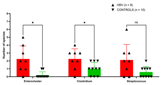 Boxplot showing the number of species per sample identified by culturomics in the three genera with a significant frequency difference between patients with chronic hepatitis B virus (HBV) infection (Red) versus the control group (Green). Two-tailed Mann–Whitney test; * p value < 0.05. ns: not statistically significant.