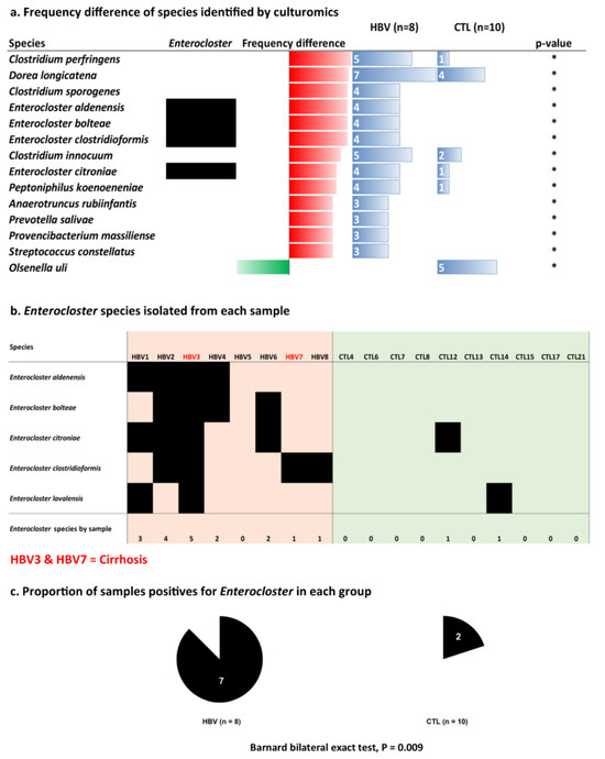 (a) Species with a significant frequency difference between chronic hepatitis B virus (HBV) and control (CTL) samples by the culturomics approach. (b) Detailed Enterocloster species isolated per sample. (c) Proportion of samples positive for Enterocloster species. Barnard’s bilateral exact test was used to test the p-value. * p-value < 0.01.