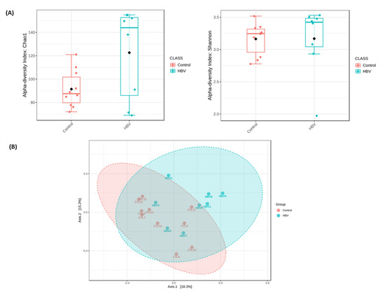 Comparison of alpha diversity and beta diversity in patients with chronic hepatitis B virus (HBV) and control groups. (A) Alpha diversity in box plots. Each boxplot represents the data range (whiskers), upper and lower quartiles (edges), the median (horizontal line), and the mean (black diamond). (B) Principal coordinate analysis (PCoA) plot of beta diversity.