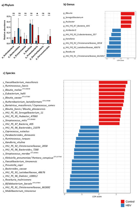 Relative abundance of gut microbiota in patients with chronic HBV infection (n = 8) and the control group (n = 10). (a) Barplot expressing abundant phyla. (b) Genus-level and (c) species-level were selected via LEfSe (LDA score > 2). Some OTUs correspond to several species (see Table S5). For clarity, only one clinically relevant species is represented on the graphic. HBV: Hepatitis B virus; LEfSe: linear discriminant analysis effect size; LDA: linear discriminant analysis; OTUs: operational taxonomic units. ns: not statistically significant. * p < 0.05.
