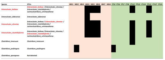 Enterocloster and Clostridium species detected in 16s RNA sequencing data file per sample. OTUs: Operational Taxonomic Units; HBV: hepatitis B virus infection; CTL: control. E. bolteae, E. citroniae, and E. clostridioformis (red words) were identified equivocally.
