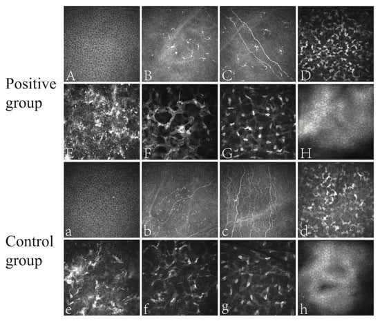 Corneal confocal microscopy in the positive and control groups after SMILE. Positive group: (A) corneal epithelial layer; (B) epithelial inflammatory cells; (C) nerve fibers and surrounding dendritic cells; (D) superficial corneal stroma; (E) hyperreflective debris of the surgical interface; (F), activated stromal cells in the shape of polygons or crab claws; (G) deep corneal stroma; (H) endothelial surface. Control group: (a) corneal epithelial layer; (b) nerve fibers and surrounding inflammatory cells; (c), nerve fibers; (d), superficial corneal stroma; (e) hyperreflective material at the surgical interface; (f) activated corneal stroma; (g) deep corneal stroma; (h) endothelial surface.