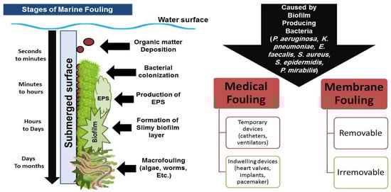 Fouling is a term used to describe the deposition of undesirable organic or inorganic materials on external surfaces. There are two major types of fouling: non-biological and biological fouling (biofouling). Non-biological (also known as inorganic fouling) includes the accumulation of corrosions, oils, salt crystals, and ice on submerged surfaces. Biofouling is the undesirable deposition of organic elements secreted by micro- or macro-organisms (biofilm, EPS, etc.) over submerged surfaces [7,21,22]. As the habitual conditions and causative microorganisms vary, medical, maritime, and industrial fouling forms are very different from one another. While maritime and industrial biofouling are combinations of biofilm and macro- and inorganic fouling, medical biofouling is primarily made up of biofilm buildup [23].