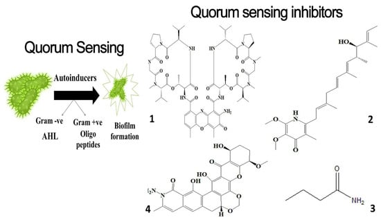 It is interesting to note that different bacteria’s ability to produce biofilms was greatly reduced by the wasted culture media of Streptomyces parvulus strain HY026. The active ingredient F1-4, also known as actinomycin D, which forms a considerable amount of the culture spent, considerably reduces the amount of violacein produced by Chromobacterium violaceum while having no inhibitory effect on bacterial growth at a dosage of 12.5 mg/mL. It also prevents prodigiosin production by Serratia proteamaculans with a 13.5 mm pigment inhibition zone at a concentration of 25 mg per disc. Additionally, waste media containing actinomycin D prohibit the biofilm formation by Pseudomonas aeruginosa PAO1, Staphylococcus aureus, Micrococcus luteus, and Ruegeria sp. in a dose-dependent manner [183]. When used against P. aeruginosa PAO1, actinomycin D significantly minifies the motility and down-regulates the expression of other virulence determinants, including pyocyanin, protease, rhamnolipid, and siderophores. It also attains prominent QSI ability, as it inhibited the production of N-(3-oxododecanoyl)-L-homoserine lactone and N-butanoyl-L-homoserine lactone [184]. Streptomyces xanthocidicus KPP01532 extracts opulent with piericidin A and glucopiericidin A elucidate prominent QSI abilities against the phytopathogen Erwinia carotovora subsp. Atroseptica [185].