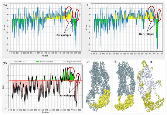 Graphical representation of the immunogenic epitopes. (A) Hydrophilicity; (B) linear epitope prediction. The green residues in all these graphs represent the non-epitope residues, while the ones in yellow represent the potential epitopes. (C) Discotope prediction of the conformational and discontinuous epitopes of the protein. The residues in green represent discontinuous but conformational epitopes; (D) Ellipro illustration of the first B-cell epitope, residues 699–733, as conformational and surface accessible; (E) Discotope 2D validating the Ellipro prediction; (F) 3D representation of all the conformational epitopes of the protein. The residues on the plots encircled in red represent the two finalized epitopes.