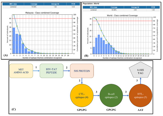 (A) Malaysian population coverage of the vaccine candidate; (B) world population coverage of the vaccine candidate; (C) the vaccine construct, where 1 represents EAAAK, 2 represents GSSS, and 3 represents HEYGAEALERAG linkers. Red line: minimum number of epitope hits / HLA combinations recognized by 90% of the population.