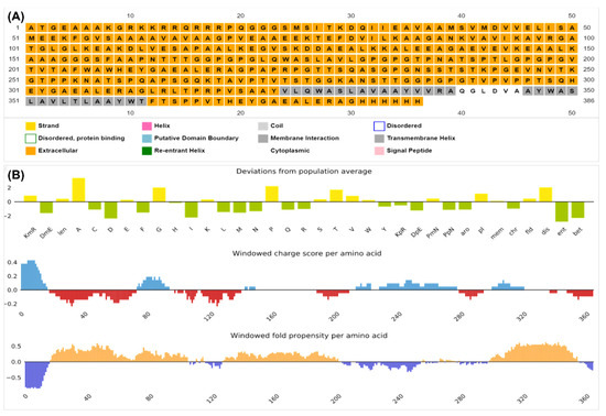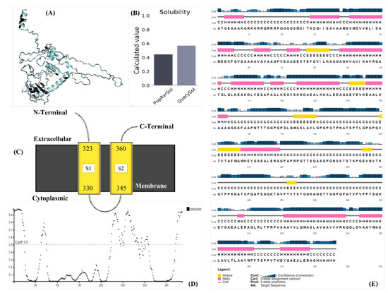 (A) MEMSTAT of the protein translating the localization shown in Figure 4; (B) vaccine candidate solubility predicted by PSIPRED.