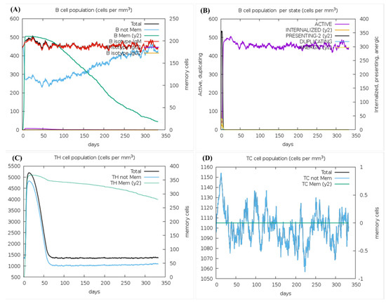 Immune simulation analysis. (A) B-cell population; (B) B-cell population per state; (C) TH (Helper-T) cell population; (D) TC (Cytotoxic-T) cell population.