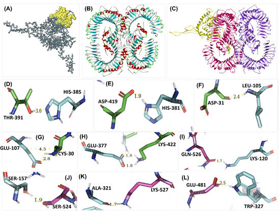 (A) The conformational B-cell epitope predicted earlier is conserved in the final vaccine construct; (B) the 3D structure of TLR-2 (protein code: O60603) obtained from UniProt KB; (C) the docked complex, where the purple-colored chains are the non-interacting chains and the ones in pink have been predicted to interact with the vaccine candidate, whereas the vaccine candidate is shown in yellow color; (D–L) some of the molecular interactions showing bond length and AA residue involved, where the blue residues belong to the vaccine candidate and the pink/green residues belong to TLR-2.