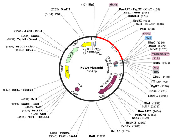 Since the vaccine candidate was designed for a human host, codon optimization was obtained by subjecting the vaccine candidate amino acid sequence to JCAT (http://www.jcat.de/) accessed on 24 August 2022. The pasted sequence was specified as ‘protein’, and ‘Homo sapiens’ were selected as the target organism. The raw and the optimized constructs were then checked for conservation using ClustalW (https://www.genome.jp/tools/clustalw/) accessed on 24 August 2022 to ensure that no amino acid had been changed during optimization. The EMBOSS transeq tool (https://www.ebi.ac.uk/Tools/st/emboss_backtranseq/) (accessed on 25 August 2022) was used to reverse translate the protein sequence for expression analysis. pET 28a (+) was used from the Snapgene plasmid resource as a plasmid for the expression, and the analysis was performed using the Snapgene offline software, downloaded from https://www.snapgene.com/ accessed on 25 August 2022.