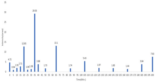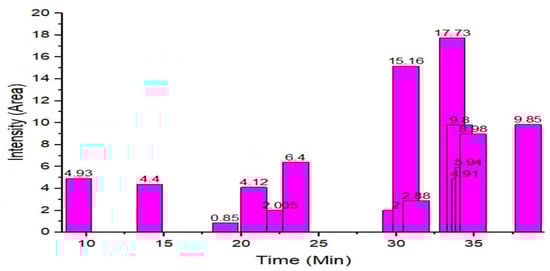 The GC–MS results of Ziziphus jujube revealed that phytol was the most abundant compound (with a 17.73% intensity) detected at 35 min (Table 3) on the GC–MS column, and n-hexadecanoic acid with a 15.16% intensity was detected at 30 minutes (with the attribute of being antibacterial). Fifteen peaks were detected in GC–MS chromatogram for ethanolic extracts of the leaf extract of Ziziphus jujube (Figure 3). Eighteen peaks were detected in GC–MS chromatogram for ethanolic extracts of the flowers of Acacia nilotica (Figure 4, Table 4).