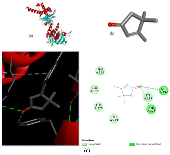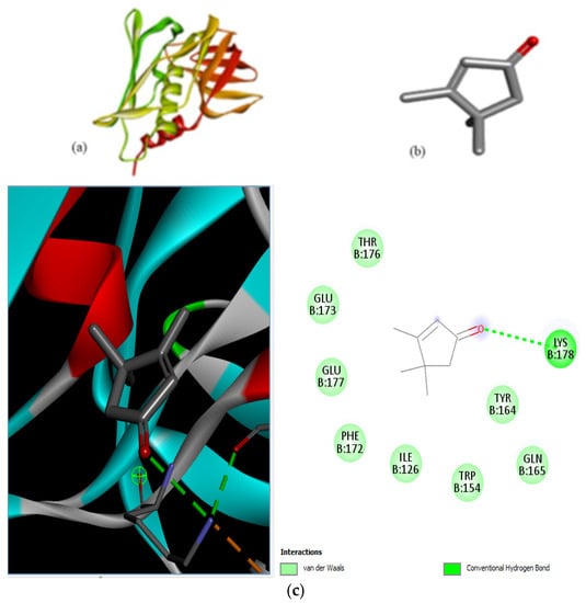 Molecular docking of Staphylococcus aureus protein with cyclopentene ligands of Ziziphus jujube plant. (a) Toxic shock syndrome toxin-1 target protein PDB structure. (b) 2-Cyclopenten-1-one,3,4,4-trimethyl-ligand PDB structure. (c) 2-Cyclopenten-1-one,3,4,4-trimethyl showing interaction with target protein and 2D structure showing interaction with residues.