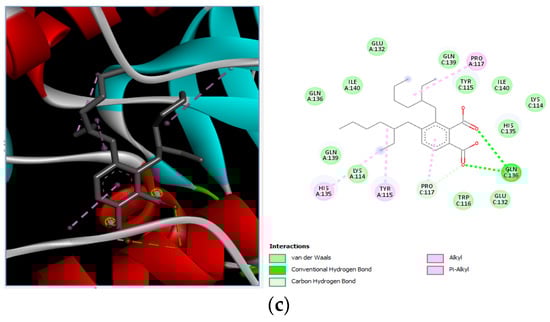 Molecular docking of Staphylococcus aureus protein with phthalate ligands of Ziziphus jujube plant. (a) Toxic shock syndrome toxin-1 target protein PDB structure. (b) Bis(2-ethylhexyl) phthalate ligand PDB structure. (c) Bis(2-ethylhexyl) phthalate—showing interaction with target protein and 2D structure showing interaction with residues.