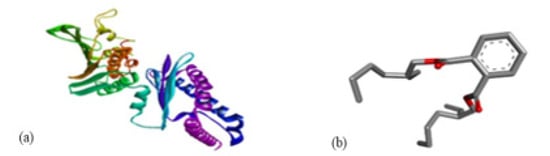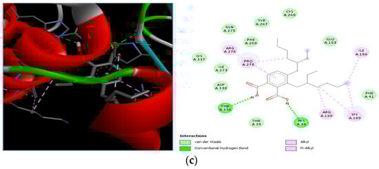 Molecular docking of E. coli protein with phthalate ligands of Ziziphus jujube plant. (a) DNA Gyrase target protein PDB structure. (b) Bis(2-ethylhexyl) phthalate ligand PDB structure. (c) Bis(2-ethylhexyl) phthalate—showing interaction with target protein and 2D structure showing interaction with residues.