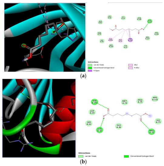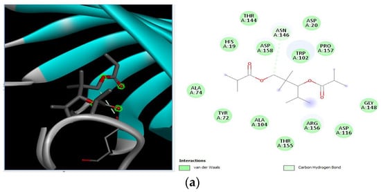 Different binding energies when the proteins of E. coli and S. aureus were docked with the binding sites of ligands are shown in Figure 9 and Figure 10. The binding energies of suberic acid monomethyl ester were higher when docked against outer membrane protein A (−5.9 kcal/mol) of E. coli and Enterotoxin B (−5.8 kcal/mol) of S. aureus and when following Lipinski’s five rules, while Topoisomerase IV and TSST-1 showed lower binding energies at −5 kcal/mol and −5.1 kcal/mol, respectively. 2,2,4-trimethyl-1,3-pentanediol di-isobutyrate showed higher negative binding energies (−6.5 kcal/mol) for E. coli protein (PDB ID: IBXW) and (−5.9 kcal/mol) against Enterotoxin B, while lower binding energies were evident for Topoisomerase IV and TSST-1 (−5.3 kcal/mol and −5.2 kcal/mol, respectively). These two phytocompounds showed higher negative binding energies and followed Lipinski’s five rules, and had strong repressive action against mastitis, while other compounds possessed less than −5 kcal/mol binding energies and were found to be less stable (Table 11).