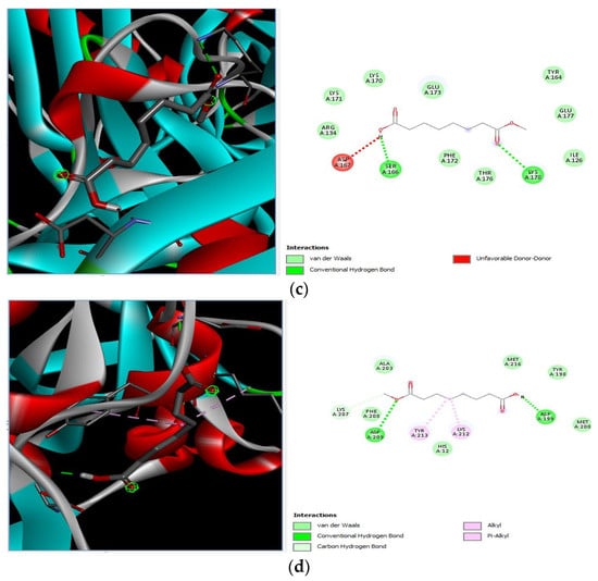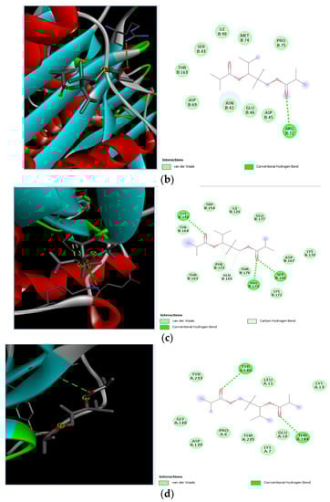 Molecular docking of 2,2,4-trimethyl-1,3-pentanediol di-isobutyrate with S. aureus and E. coli proteins. (a) 2D and 3D representations of greater binding energy between 2,2,4-trimethyl-1,3-pentanediol di-isobutyrate and outer membrane protein A. (b) Docking interaction between 2,2,4-trimethyl-1,3-pentanediol di-isobutyrate and Topoisomerase IV. (c) Docking interaction between 2,2,4-trimethyl-1,3-pentanediol di-isobutyrate and toxic shock syndrome toxin-1. (d) 2D and 3D representations of greater binding energy between 2,2,4-trimethyl-1,3-pentanediol di-isobutyrate and Enterotoxin B.