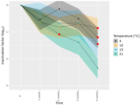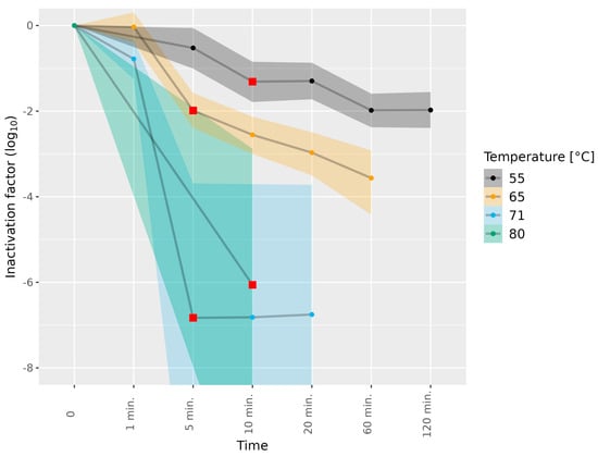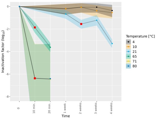 Inactivation of HEV-3c/e in dried sausage subjected to different temperatures. HEV-3c/e inactivation factors (log10) were estimated using the Bayesian MPN method. Data are representative of 2 or 3 experiments performed on different days depending on the time–temperature combination (Table 1). At least four different wells of inoculated A549/D3 cells per dilution were examined. The 95% confidence interval is indicated by colored bands. Red squares indicate the first data point, for which the 89% HDI was outside of the ROPE interval (−0.5, 0.5), and denote a meaningful reduction in infectious HEV.