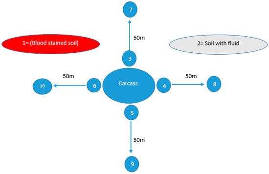 Soil sampling sites from areas suspected of anthrax outbreaks, illustrating ten distinct locations from which soil samples were collected within a single outbreak. Site 1, characterized by blood-stained soil, and Site 2, featuring soil contaminated with bodily fluids, were identified as locations where animal carcasses had either expired or were disposed of. Meanwhile, Sites 3, 4, 5, and 6 were sites surrounding the carcass in all four directions (east, west, south, north), while Sites 7, 8, 9, and 10 were located 50 m away in all these four directions.
