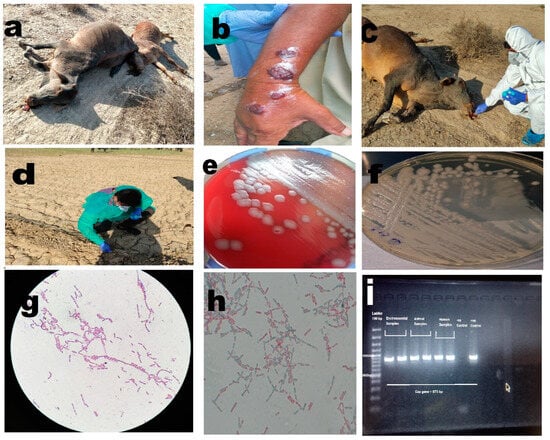 (a) Anthrax outbreak in animals, illustrating cases of infection among animals. (b) Cutaneous anthrax case in a human, depicting an individual affected by cutaneous anthrax. (c) Collection of soil samples around the carcass, highlighting the process of collecting soil samples in the vicinity of animal carcasses. (d) Collection of plant root samples from infected sites, showing the collection of plant root samples from areas affected by anthrax. (e) Non-hemolytic growth of Bacillus anthracis on blood agar, displaying the characteristic non-hemolytic growth pattern of Bacillus anthracis on blood agar medium. (f) Growth of Bacillus anthracis on PLET agar, illustrating the growth of Bacillus anthracis on PLET agar medium. (g) Bacillus anthracis showing Gram-positive rods in long chains, visualizing the Gram-positive rod-shaped morphology of Bacillus anthracis arranged in elongated chains. (h) Bacillus anthracis with spores, depicting the presence of spores in Bacillus anthracis. (i) PCR bands for Bacillus anthracis capsular gene, showcasing the PCR results demonstrating specific bands corresponding to the capsular gene of Bacillus anthracis.