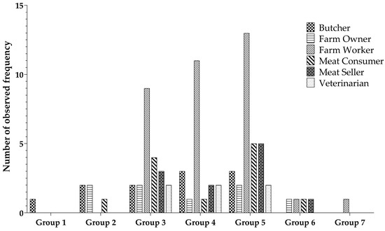 The ANTXR1 quantitative ELISA assay was used to determine the level of ANTXR1 in various professions associated with animal contact. Participants primarily consisted of farm workers (44%), farm owners (8%), butchers (13%), meat sellers (14%), and veterinarians (6%). Participants’ samples were categorized into seven groups according to their ANTXR1 concentration levels. Group 1 exhibited the highest concentration, while group 7 had the lowest concentration, with a gradual decrease in concentration from group 1 to group 7. Notably, group 5 contained the largest number of samples, with subsequent placements held by group 4 and group 3, as visually depicted in Figure 4. There is a non-significant difference regarding the observed frequency among the different occupational groups.