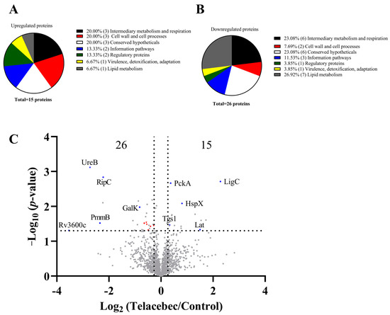 Proteomic profiling of BCG treated with 10 nM telacebec for 7 h. (A,B) Functional category analysis of the upregulated (A) and downregulated (B) proteins was performed based on Mycobrowser (https://mycobrowser.epfl.ch/, first accessed on 12 September 2022). For each classification, the number of proteins (in bracket) and the percentages are shown. (C) Volcano plot showing downregulated (upper left) and upregulated (upper right) proteins in the treated bacilli as compared with the untreated control. Each dot/triangle (in grey, red or blue color) indicates a different protein. Names of particular proteins are given (see blue dots). Proteins required for lipid metabolism are emphasized by red dots/triangles, with those involved in PDIM biosynthesis indicated by triangles. The dot line parallel to the x-axis indicates a y value of 1.301 (i.e., −log10·0.05). The two dot lines parallel to the y-axis indicate x values of −0.263 (i.e., log2·0.833) and 0.263 (i.e., log2·1.2), respectively.