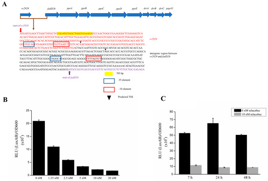 We further assessed the expression of the faD26-papA5 operon, as representative PDIM/PGL-synthesizing gene loci. The transcriptional activity of the first promoter of this operon, upstream to the fadD26 gene, was investigated using a luciferase reporter system (Figure 2A) [15]. We constructed the pfadD26-luxAB plasmid containing the luxAB luciferase genes from Vibrio harveyi in the pSMT1 vector [23]. A 705 bp 5′-upstream region of the fadD26 gene, predicted to harbor 2 putative promoter sites using the BPROM software (http://softberry.com, accessed on 1 July 2018) and reported to contain 2 transcriptional start sites (TSS) (Figure 2A), was inserted in the pSMT1 vector to replace the original mycobacterial cpn60.2 promoter to control the luxAB transcription [23,28]. The luciferase activity obtained in the pfadD26-luxAB-transformed BCG showed high RLU values, demonstrating a strong promoter activity (Figure 2B). This activity was strongly reduced after 24 h telacebec treatment, depending on the telacebec concentration, achieving a 2- to 12-fold reduction. Notably, 1.25 nM telacebec (1/4 of the MIC) already decreased the promoter activity (Figure 2B), suggesting that the effect on PDIMs/PGLs occurs before the inhibition of bacillary growth. This effect was observed after 7 h treatment (Figure 2C), in agreement with our proteomic data showing a decreased level of proteins encoded in the operon.