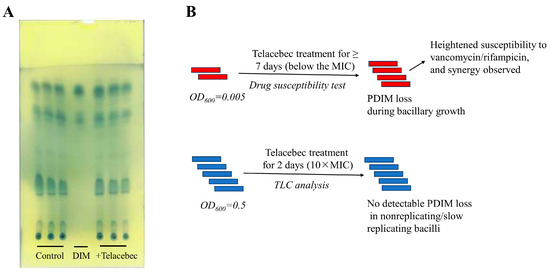 To investigate whether the synergy could be due to a potential effect of telacebec on PDIM production, TLC analysis was performed. Relative to control, the telacebec (10 × MIC)-treated BCG did not show a detectable decrease in PDIM amount (Figure 3A). However, based on the data, the effect of telacebec on PDIM production could not be negated as this concentration of telacebec could expectedly inhibit the growth of the bacilli, potentially leading to the retaining of previously synthesized cell wall PDIMs (Figure 3B).